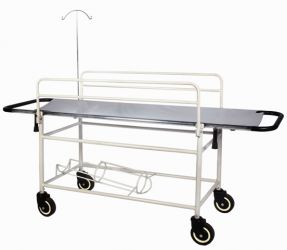 MS Structure with SS Top Stretcher, I.V. rod, oxygen cylinder cage, mounted on four 125mm castor, a pair of MS swing away type safety rails. Pre treated and epoxy powder coated finish (2032(L) x 560(B) x812(H)