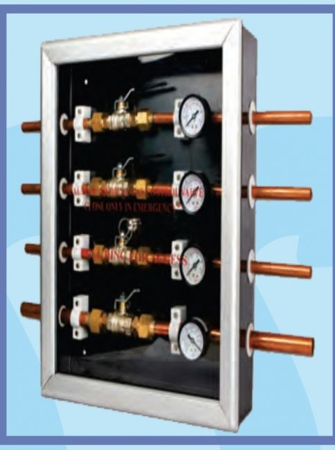 It is wall mounted, Aluminum box with lockable front fibre- glass panel having ball type valves (manufactured by ISO-9001 company & factory degreased) with PTFE seat, Brass body with chrome-plated brass balls having quarter turn handle opening. Sizes suitable for 15mm OD copper pipe to 28 mm OD copper pipes should have screwed ends should have brass adopter suitable for copper pipe.